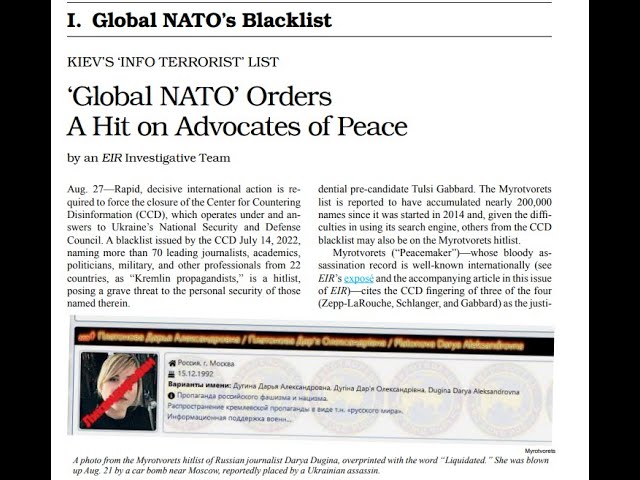 And that EIR report further states that it has now confirmed that at least five of those fingered by the CCD are included in the list of “criminals to be eliminated” published by the avowedly fascist “Myrotvorets” gang in Ukraine: Schiller Institute founder and leader Helga Zepp-LaRouche; Schiller Institute spokesman Harley Schlanger; former CIA officer and active anti-war activist Ray McGovern, the co-founder of Veteran Intelligence Professionals for Sanity (VIPS), who has participated in Schiller Institute conferences; former UN weapons inspector Scott Ritter; and former U.S. Congresswoman and Democratic presidential pre-candidate Tulsi Gabbard. The Myrotvorets list is reported to have accumulated nearly 200,000 names since it was started in 2014 and, given the difficulties in using its search engine, others from the CCD blacklist may also be on the Myrotvorets hitlist.