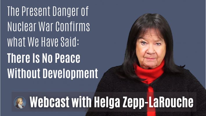 Helga Zepp-LaRouche issued a direct challenge to viewers today, that they join the discussion process underway around what she presented as 10 Principles of a new security and development architecture as a matter of utmost urgency. There is a “daily escalation” of the war danger, she said, citing Russian Foreign Ministry spokeswoman Zakharova, who said the war in Ukraine is now a war “between NATO and Russia.”