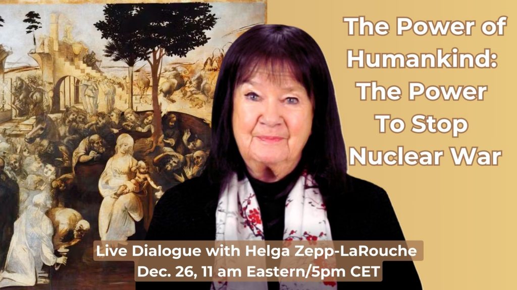Join Helga Zepp-LaRouche Dec 26, 11am Eastern/5pm CET in her Weekly Live dialogue and help usher in the Year of the New Paradigm for all Humanity. Send your questions, thoughts and reports to questions@schillerinstitute.org or ask them in the live stream. In the course of … Continue reading Webcast: The Power of Humankind: The Power To Stop Nuclear War