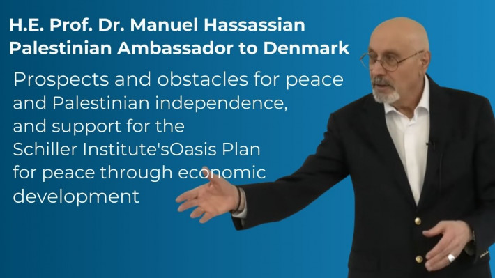 H.E. Prof. Dr. Manuel Hassassian, who has just retired from his post in Denmark, presented his parting evaluation about the prospects and obstacles for peace and Palestinian independence, and his support for the Schiller Institute’s Oasis Plan for peace through development. A transcript will be available later.