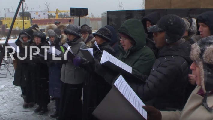 Members of the NYC Schiller Institute Community Chorus sing the Russian National Anthem outside the Russian Consulate in New York in honor of the passengers, many of them members of the Alexandrov Ensemble, who died when their plane crashed enroute to Syria, Sunday, December 25, 2016.