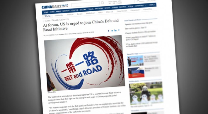 China Daily cited Zepp-LaRouche’s videotaped message tothe forum held by the Schiller Institute and the P.R.C. Consulatein Glendale two days ago, on the subject of “China’s Belt andRoad Initiative — A Historic Opportunity for the U.S.A.”