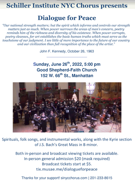 Readings from Friedrich Schiller’s works, recited by actor Dikran Tulaine, were interspersed with the musical selections throughout. The program began with Schiller, followed by Bach, then two Spirituals—each separated by the words of Schiller and William Shakespeare, then Brahms’ “Dem dunkeln Schoss der Heil’gen Erde,” and the Choral Fantasia, also preceded by a reading from Schiller. Following the intermission, the entire Beethoven Mass in C Major, prefaced by Schiller, was performed. As always, the Schiller Institute performed at the Verdi tuning of C=256 cycles, the proper tuning for Classical composition, sometimes erroneously characterized as “lower” tuning.