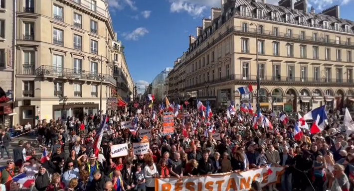 Oct. 9 (EIRNS) — A large crowd, certainly many thousands judging from video of the event on Twitter, demonstrated in Paris today with the slogan “Let’s Get Out of NATO,” many waving the Tricolor. One person passing on the tweet said, “Tens of thousands in Paris say France must leave NATO.” [The Twitter video is here.]