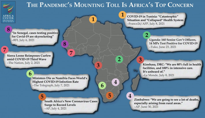 July 27, 2021 (EIRNS)—On July 9 the Africa Center for Strategic Studies warned, “The surge of the Delta coronavirus variant in Africa is set to cause hundreds of thousands of deaths in the coming months, absent a dramatic scaling up of prevention measures and COVID vaccine access.” Now just 18 days later, the North, South, and East of Africa have exploded with new COVID cases. The latest infographic from the Africa Center dated July 12, shows total known confirmed cases of COVID in Africa at 5,984,845 since the beginning of the pandemic. View the time-lapsed map here.