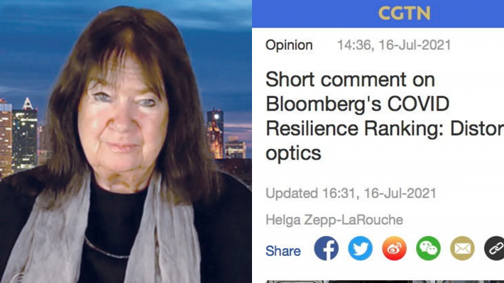 July 16 (EIRNS)—A commentary from Helga Zepp-LaRouche, responding to “COVID Resilience Rankings” determined by Bloomberg, was published by CGTN today. Zepp-LaRouche lambasts the Bloomberg report, which gave the U.S. higher marks than China, in which she states, “Essentially this ranking is a demonstration of the thesis, that one can prove anything with statistics, as long as you define how the statistics are constructed. While most of the nominal facts of the listed rankings appear to be factual, the accompanying article in the section ‘Containment Formula’ belies the overall purpose and bias hidden behind the statistics. Here the worry is expressed, that the ‘underperformance of some of the world’s most prominent democracies’ as compared with ‘authoritarian countries like China’ has raised questions about the ability of democratic societies to cope with pandemics.”