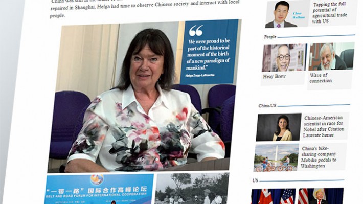 In der US-Ausgabe der offiziellen chinesischen Zeitung China Daily erschien am 18.8. ein ausführlicher biographischer Artikel des USA-Korrespondenten Chen Weihua über Helga Zepp-LaRouche. Der Beitrag trägt die Überschrift „Identifikation mit China“ und den Untertitel „Helga Zepp-LaRouche sieht in der Belt and Road Initiative die Erfüllung eines lebenslangen Zieles von ihr und ihrem Ehemann, dem amerikanischen politischen Aktivisten Lyndon LaRouche“.