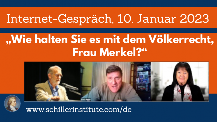 Helga Zepp-LaRouche, Gründerin des Schiller-Instituts und Vorsitzende der Bürgerrechtsbewegung Solidarität (BüSo), Scott Ritter, ehemaliger UN-Waffeninspekteur im Irak und Ray McGovern, Mitgründer der Veteran Intelligence Professionals for Sanity (VIPS) sprachen am 10. Januar während des Internet-Gesprächs „Wie halten Sie es mit dem Völkerrecht, Frau Merkel?“