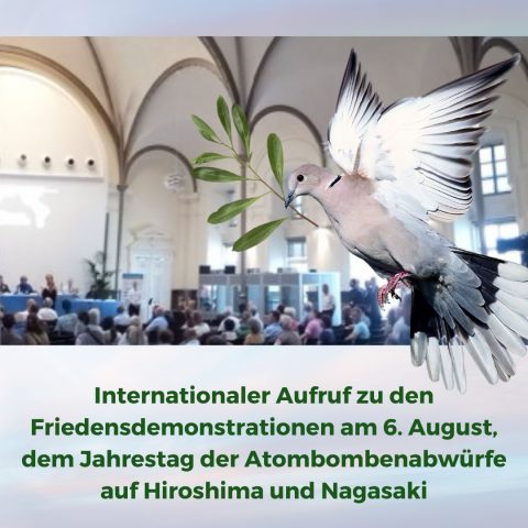 Wir, die Unterzeichner, rufen alle Friedensbewegungen weltweit und alle friedliebenden Kräfte auf, am 6. August für einen sofortigen Waffenstillstand zu demonstrieren und Bedingungen zu schaffen, unter denen Atomwaffen nie wieder die Existenz der Menschheit bedrohen werden.