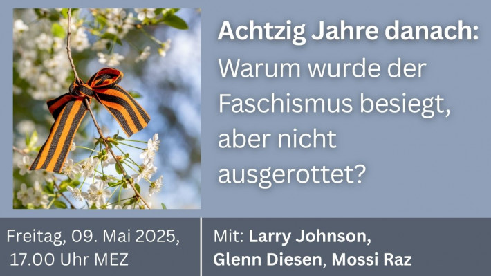 In dieser Woche jährt sich zum 80. Mal der Sieg über den Faschismus. Sie und ihre Organisationen sind herzlich zu einer intensiven Diskussion mit Larry Johnson, Glenn Diesen, Mossi Raz und anderen eingeladen. Bitte berichten Sie von Ihren Aktivitäten und Initiativen.