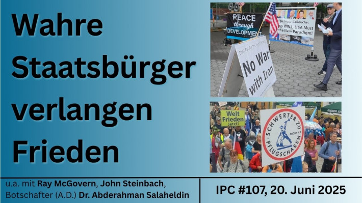 Helga Zepp-LaRouche, Gründerin des Schiller-Instituts und Initiatorin der Internationalen Friedenskoalition, beantwortete in ihrem wöchentlichen Webcast des Schiller-Instituts Fragen zur strategischen Krise. Sie wies darauf hin, dass die Amerikaner derzeit einen tiefen „Vertrauensverlust“ in ihre Regierung erleben, da ihr gewählter Präsident sich dem britischen Modell angenähert hat. Sie rief zur Stärkung der Friedensbewegung auf; es müsse alles getan werden, um die Politik zu ändern. „Die IPC ist der richtige Ort für alle, die jede Woche die Einschätzung und das Fachwissen von Menschen hören wollen, die wirklich die Wahrheit sagen und durch ihre Lebensarbeit eine Einsicht gewonnen haben, die man in den Mainstream-Medien niemals bekommen wird, zumindest nicht heutzutage … Werden Sie Teil einer Bewegung, die versucht, das zu verhindern, was das Ende der Zivilisation bedeuten könnte – nämlich den Dritten Weltkrieg …“