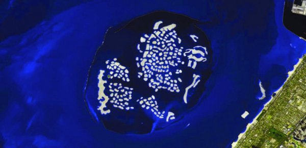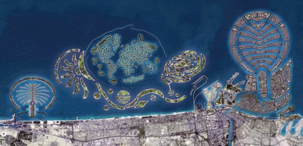 Eines davon (Abbildung 8) besteht nicht etwa darin, die Wüste zu begrünen, sondern es sollten künstliche Inseln im Meer für Touristen mit Nachtklubs, Einkaufszentren usw. entstehen. Für alle diese exklusiven Einrichtungen wurde Sand aufgeschüttet und künstliche Inseln geschaffen. (Kein Umweltschützer hatte dagegen etwas einzuwenden, obwohl sämtliche Korallenriffe dabei draufgingen.)