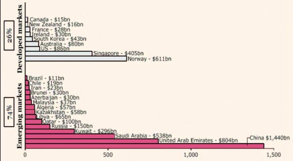 Es gibt noch eine weitere Einrichtung am Golf, die direkt mit dem internationalen Finanzsystem in Verbindung steht, die sogenannten Staatsfonds (Abbildung 11). Die arabischen Staatsfonds machen zusammen etwa 2 Bio. $ aus. Viele Großbanken und Finanziers in der City of London und an der Wall Street geraten darüber in Entzücken. Der chinesische Staatsfonds ist der größte in der Welt, aber die Chinesen setzen ihr Kapital schlauer ein. Sie sind an so etwas nicht beteiligt.
