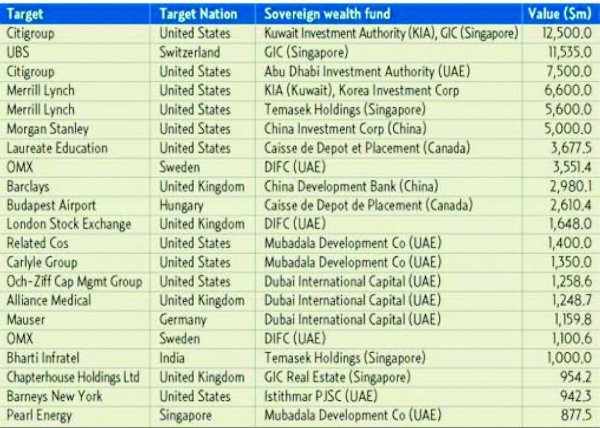 Doch die arabischen Länder ließen sich dazu verleiten, die Finanzblase und auch die Bailout-Blase zu stützen. Das geht aus einer Liste von Transaktionen hervor, die von diesen Staatsfonds zwischen 2007 und 2008 getätigt wurden (Abbildung 12). So kaufte etwa die Kuwait Investment Authority Anteile an der Citigroup (12,5 Mrd. $), Auch die Abu Dhabi Investment Authority stieg mit 7,5 Mrd. $ bei der Citigroup ein, Kuwait bei Merril Lynch mit 6 Mrd. $ usw. usw. Sämtliches Ölgeld und alles andere verschwindet auf diese Weise. Ich habe damit einmal mit unseren Freunden in Norwegen gesprochen, denn die Norweger haben das gleiche Problem mit ihren Ölgeldern.