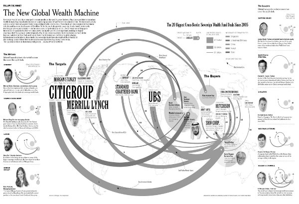 All das nennt sich die neue Global Wealth Machine (Abbildung 13). Aus dem Diagramm geht hervor, wo das Geld herkommt und wo es landet. Fast nur britische und Wallstreet-Banken sind daran beteiligt. Auf der linken Seite sieht man die Berater. Sie kommen von Lazard, und es gibt alle möglichen sogenannten Beratergruppen. Auf der rechten Seite stehen die Anwaltskanzleien, die die arabischen Golfstaaten in Finanzangelegenheiten beraten und wo sie ihr Geld anlegen sollen. Alles ist unter Kontrolle der City of London und der Wall Street.