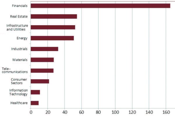 In folgende Bereiche floß das Geld (Abbildung 14): Finanztransaktionen 160 Mrd. $ seit 2008; Immobilien 60 Mrd. $; Infrastruktur und Versorgungseinrichtungen – dabei geht es nicht um den Neubau von Infrastruktur und Versorgungseinrichtungen. So kauft etwa die Dubai Ports Company bereits bestehende Häfen in Europa oder in den Vereinigten Staaten. (In den Vereinigten Staaten konnte sie noch nicht groß einkaufen, da einige Leute im Kongreß die Frage der nationalen Sicherheit aufwarfen.) Am Ende der Liste stehen Investitionen ins Gesundheitswesen.